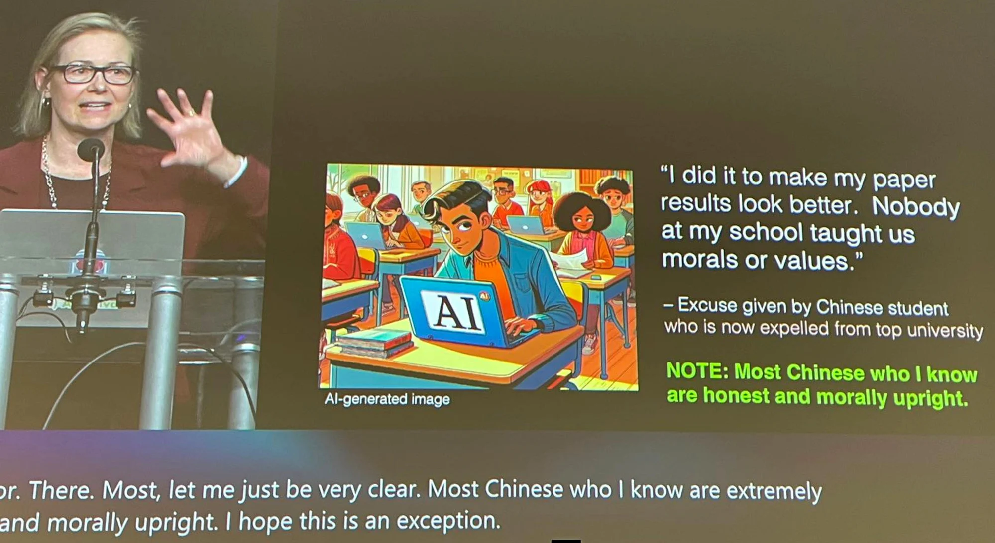 其中一頁演示引述一名「被頂尖大學開除的中國學生」為學術行為不當辯解指:「我這樣做是為了讓論文結果看上去更好。我們學校從沒有人教過我們道德和價值觀。」皮卡德還備註指:「大部份我認識的中國人都是誠實和正直的。」